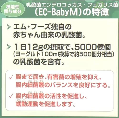 届出表示:本品には乳酸菌エンテロコッカス・フェカリス菌(EC-BabyM)と難消化性デキストリン(食物繊維) が含まれ、腸内環境と便通を改善します。
