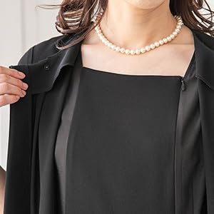 深い黒色の素材感とエレガントなデザインが見事にマッチしている印象で、暖かい時はワンピース1枚、寒い時はジャケットと合わせて通年使いやシーンに合わせた冠婚葬祭での着用が可能。